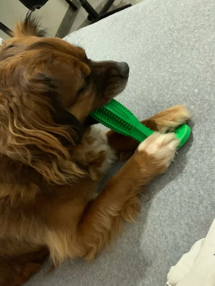 - Allow your dog to chew on the toothbrush for about 5-10 minutes at a time.